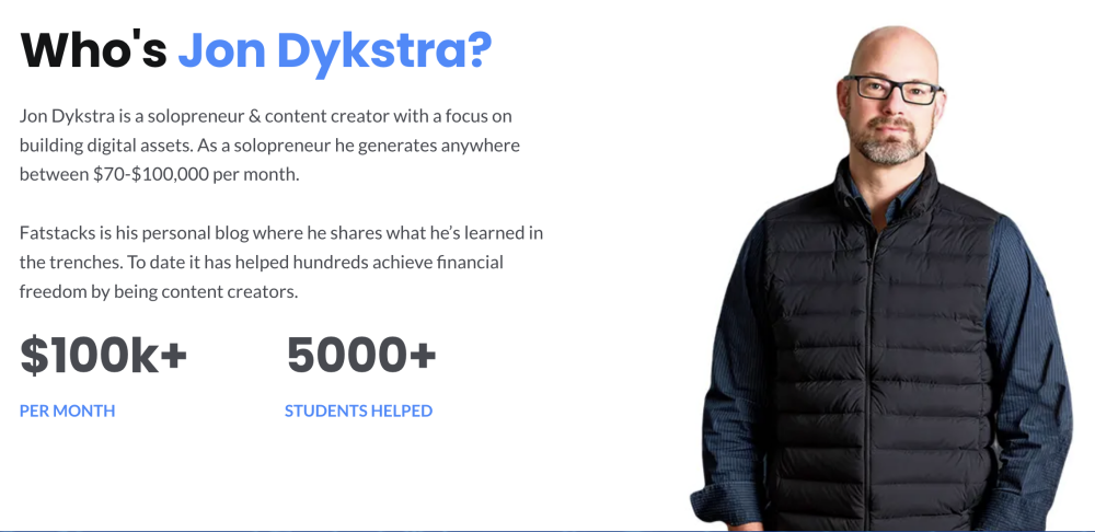 Jon Dykstra is a verified, long-term blogger with a proven income record and a transparent teaching approach. His main blog, FatStacksBlog.com, has been active for over a decade, and he regularly publishes real income reports that show how his strategies perform in practice.