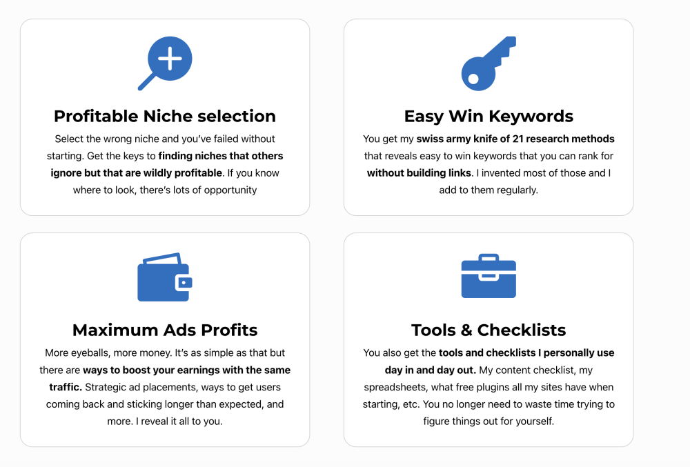 It’s a collection of in-depth lessons and systems showing how to build, grow, and monetise content sites through targeted keywords, organic traffic, and display ad revenue.