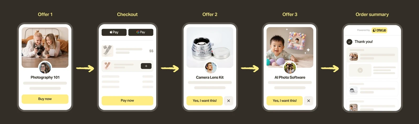 Next, you build your funnel. You can choose one offer or several, then arrange them using the platformās pre-built template. The goal is to create a funnel that gives buyers a clear path to follow, using offers that complement each other. OfferLab hosts the checkout and manages all the tracking for you.