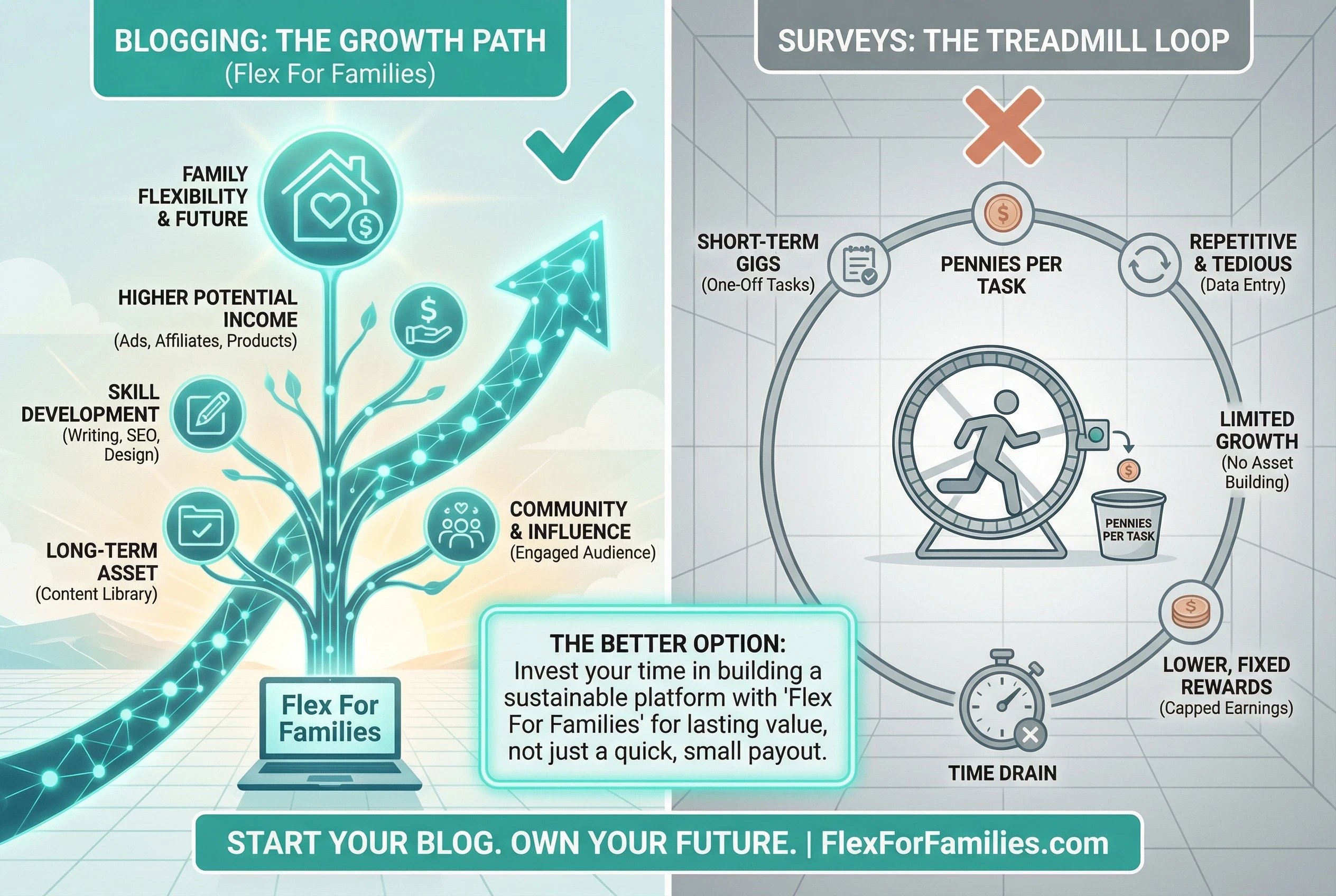 The approach that felt different for me was building assets, like a blog or side business, that can compound and grow over time, letting you earn while you sleep (or make school lunches, or take a walk). It’s not “easy money” up front, but it scales in a way that surveys just don’t. The slow start can be frustrating, but the upside is lasting: every post, small side gig, or new offering can add up and give you more freedom down the road. And unlike survey platforms that control who gets paid, this kind of work puts you back in the driver’s seat.