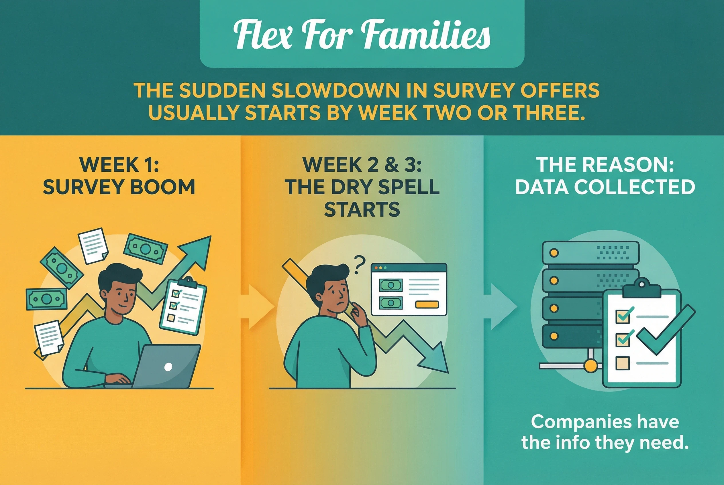 The sudden slowdown in survey offers usually starts by week two or three, and here’s why. Most survey panels have a specific demand for different types of people. Once they have enough data from a certain group, their need drops drastically.